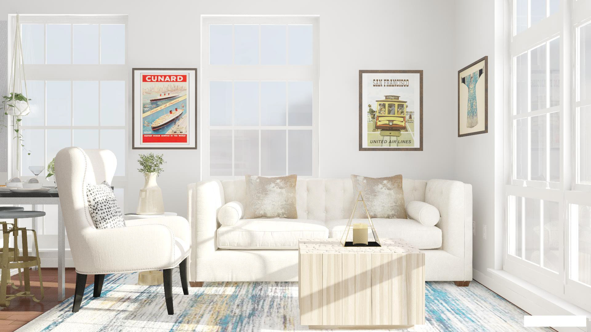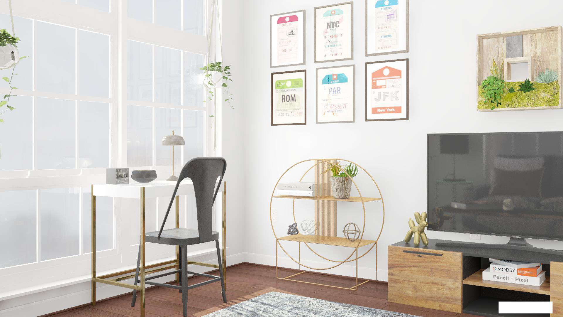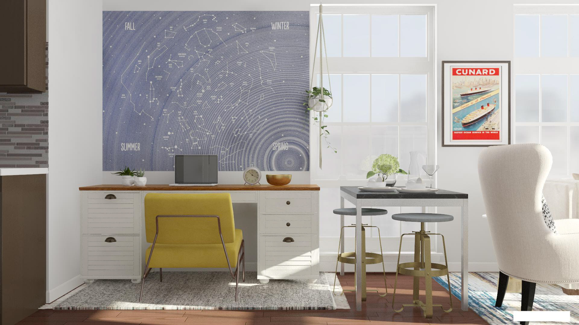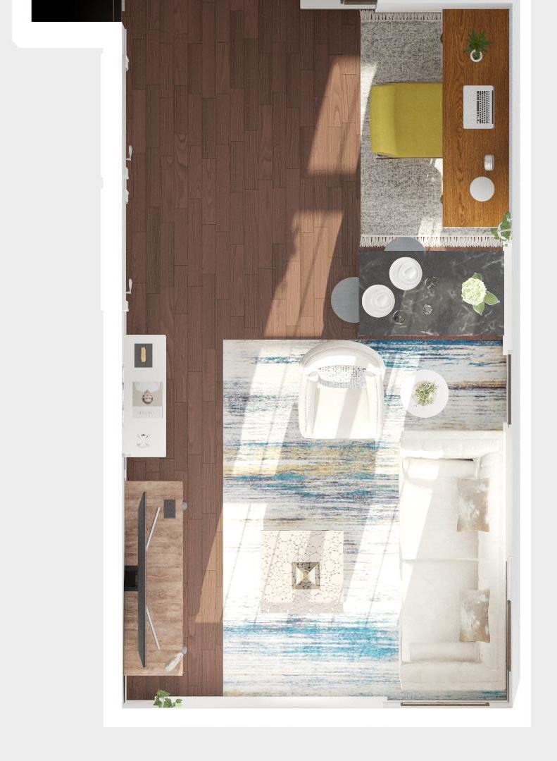 An urban look crossed with the aesthetics of a "gentleman's club." To achieve this look, classic formal and luxurious looking modern, minimalistic pieces were incorporated into the space. The client also indicated their love of world travel and wanted to incorporate this into the design somehow. This request was accommodated by including wall art that has themes of travel. This space was very narrow and the client wanted a workspace and a dining area incorporated. This was achieved by using bar height tables and chairs because of their narrow shapes, and ability to be easily tucked away.