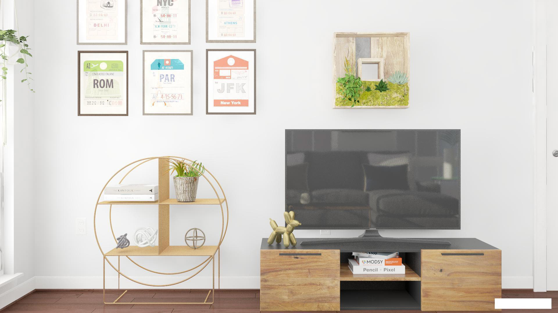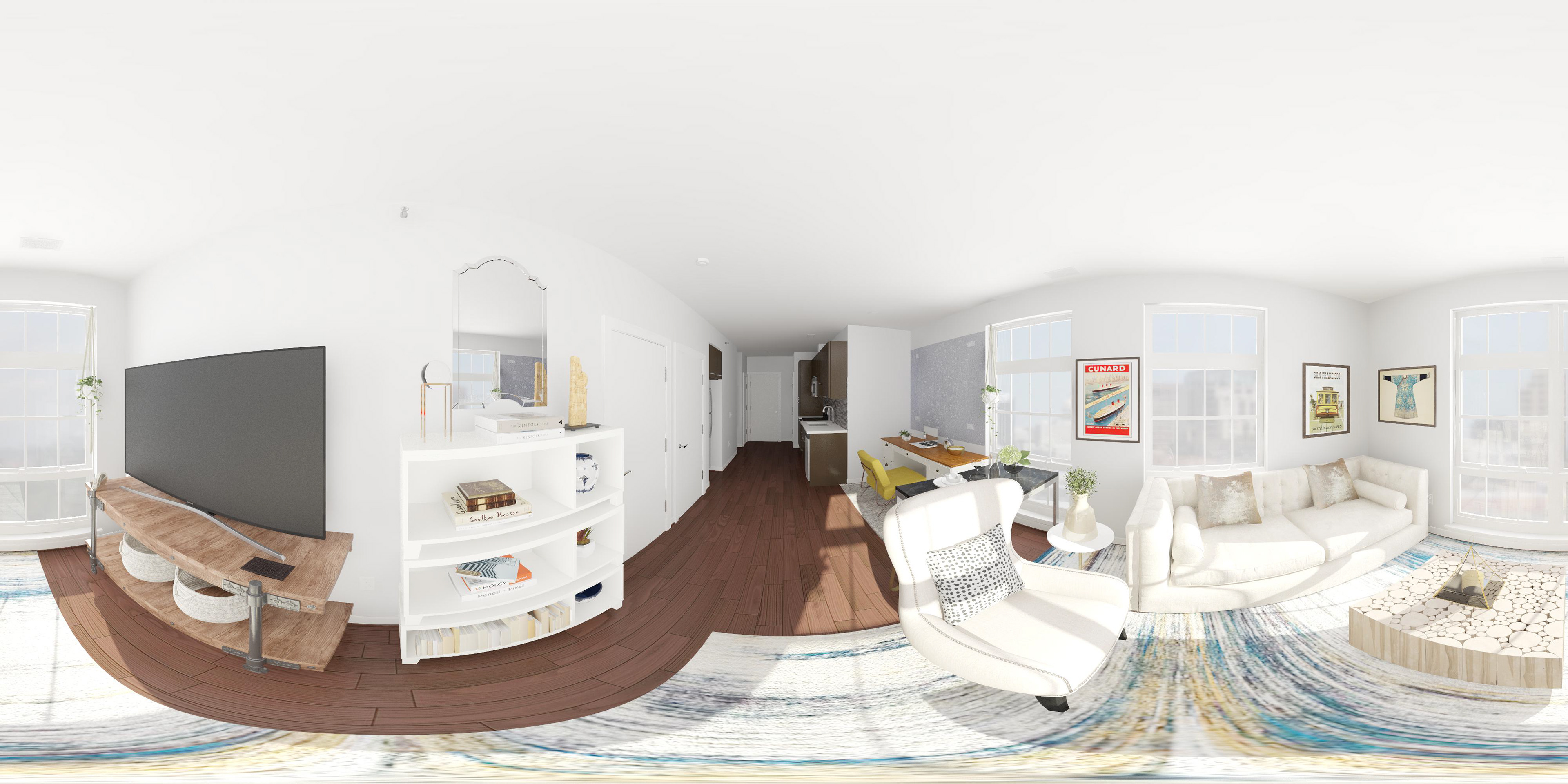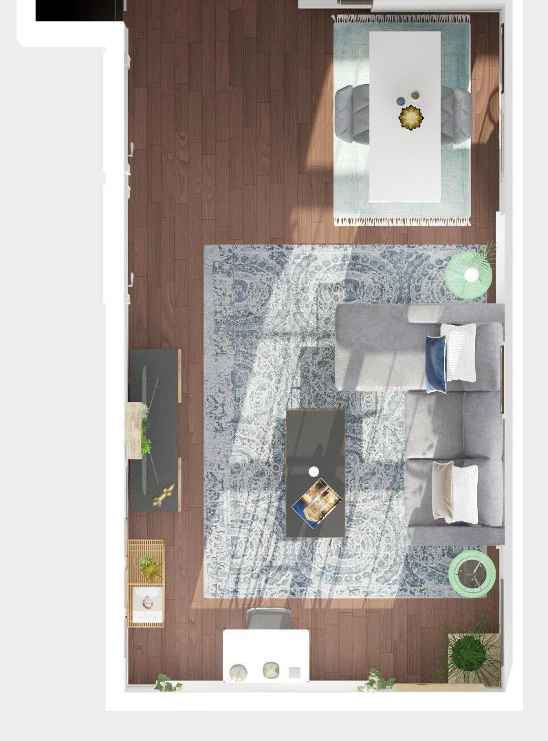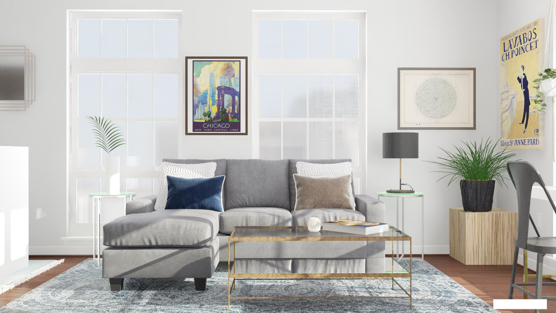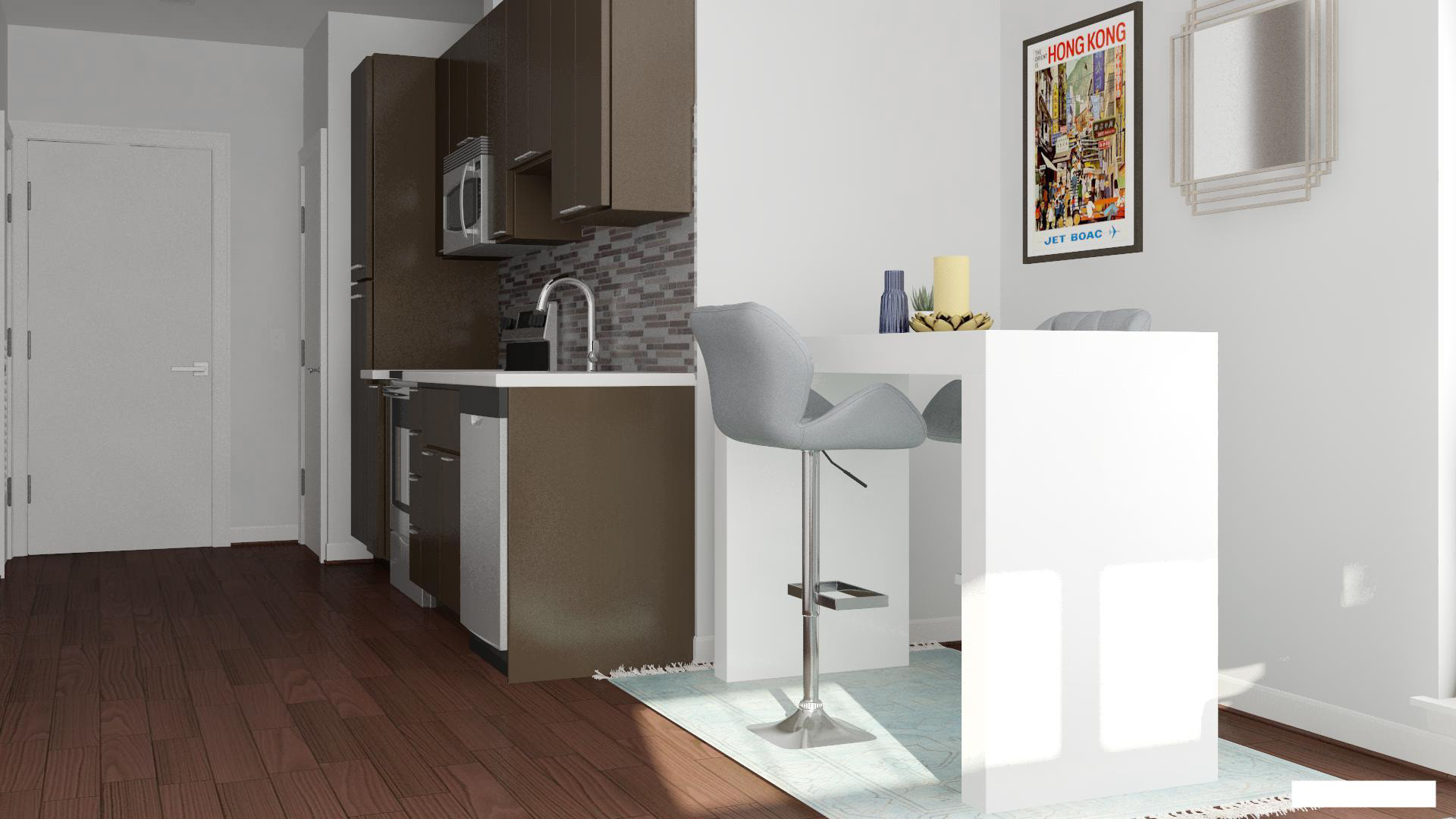 An urban look crossed with the aesthetics of a "gentleman's club." To achieve this look, classic formal and luxurious looking modern, minimalistic pieces were incorporated into the space. The client also indicated their love of world travel and wanted to incorporate this into the design somehow. This request was accommodated by including wall art that has themes of travel. This space was very narrow and the client wanted a workspace and a dining area incorporated. This was achieved by using bar height tables and chairs because of their narrow shapes, and ability to be easily tucked away.