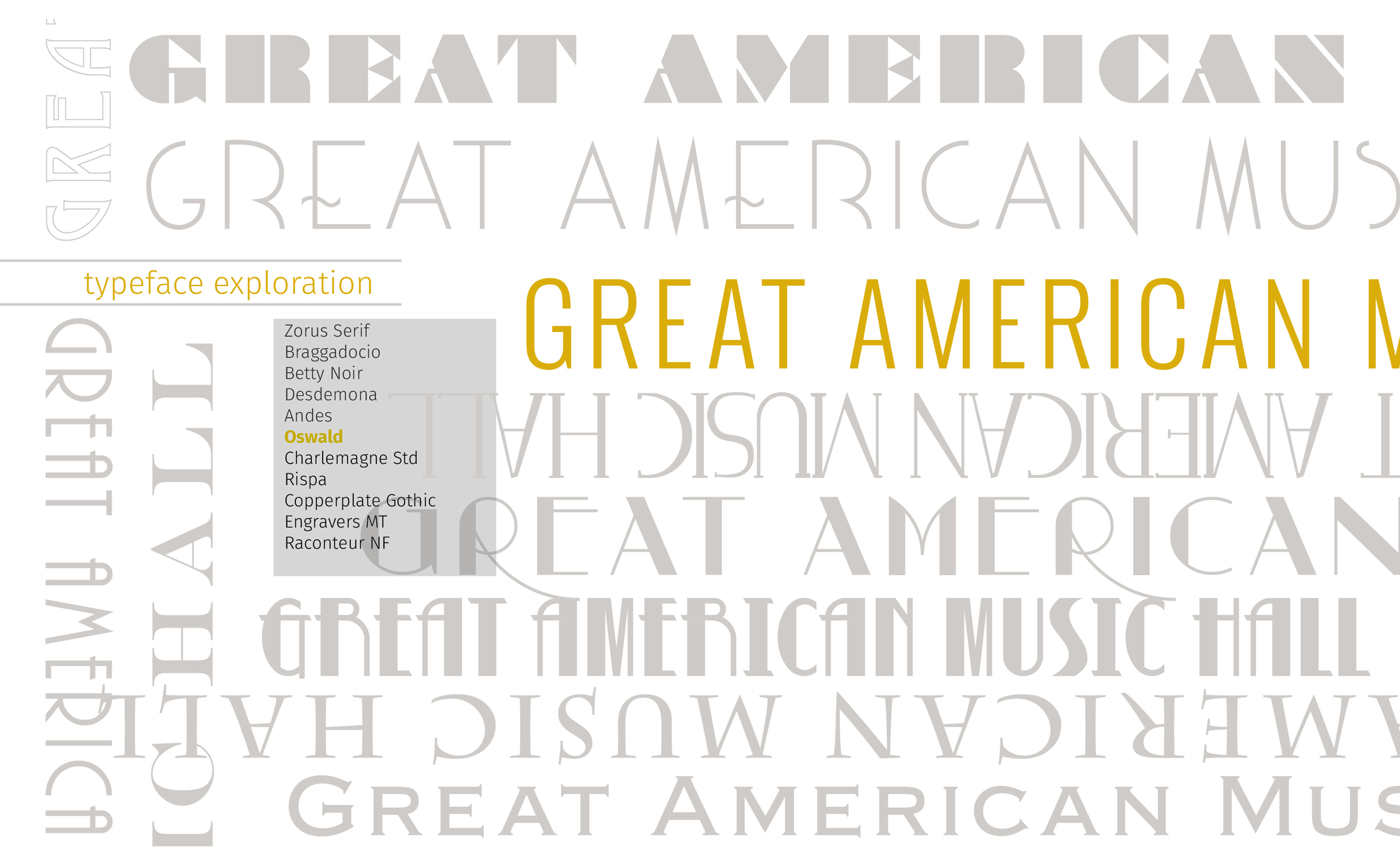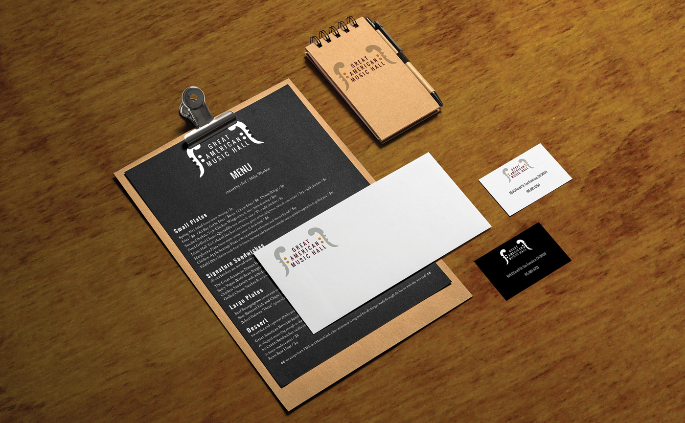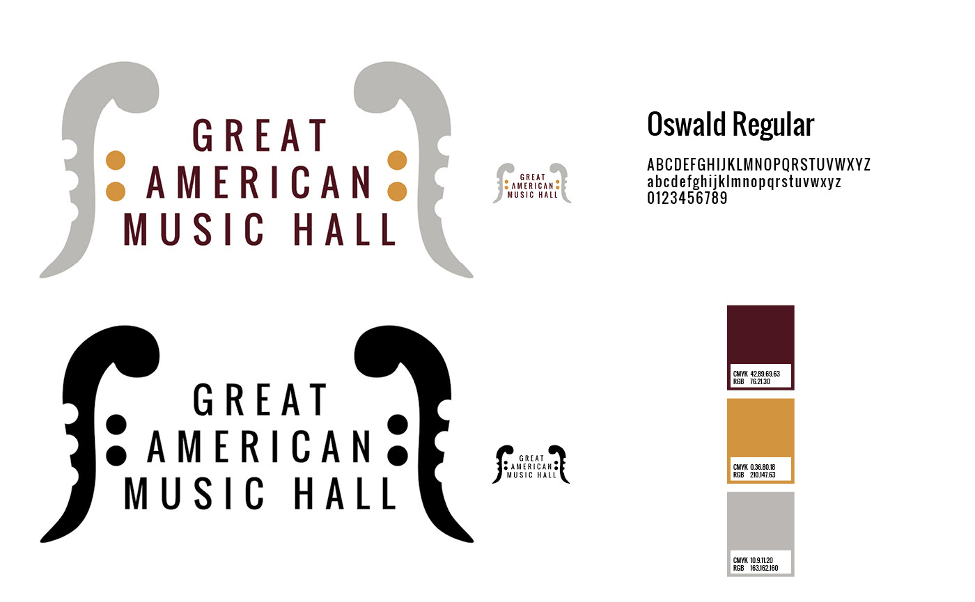 A mock-rebrand of the classic and historic San Francisco rock n’ roll venue, The Great American Music Hall. The Great American Music Hall, voted #6 best rock venue in America by Rolling Stone Magazine in 2013, is the oldest rock venue in San Francisco. In this rebrand, I wanted to design a new logo which would bring a modern and elegant feel to this historic venue. Visual inspiration for the design of the logo came from the curvature motifs, which are repeatedly seen within the interior design, building facade, and signage. The new logo also brings in the curved motifs seen in music symbols, such as the treble and bass clef. The rebrand incorporates the deep burgundy coloring of the building’s facade, along with the gold found within the interior murals of The Great American Music Hall.