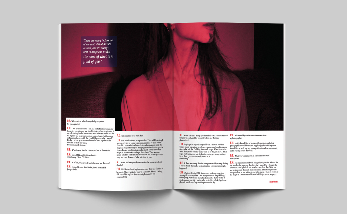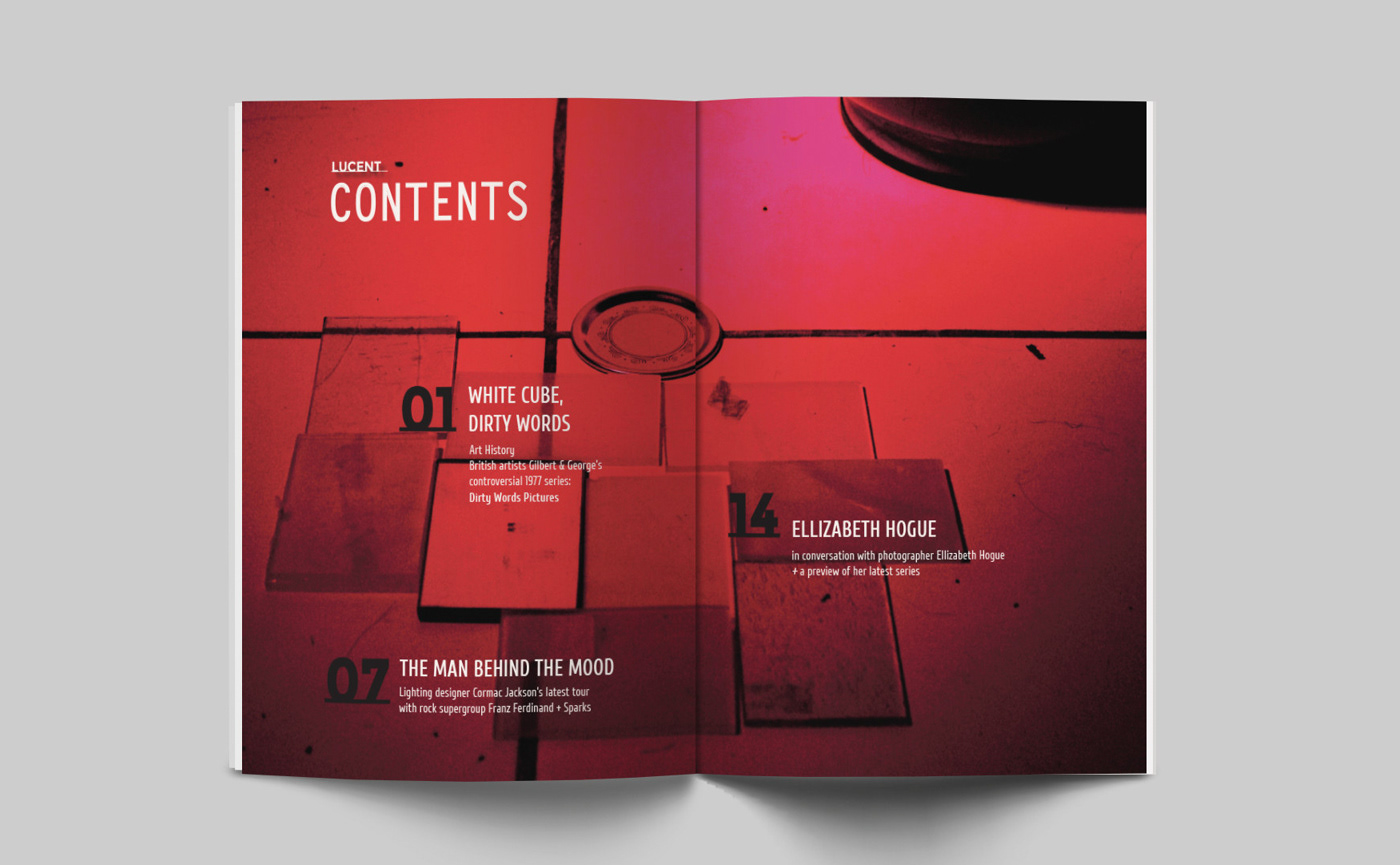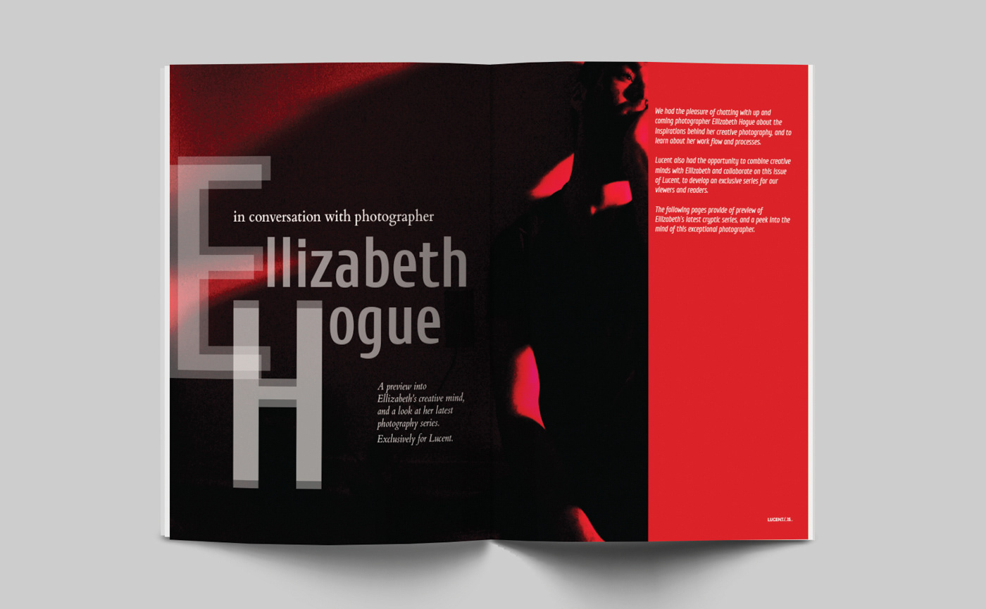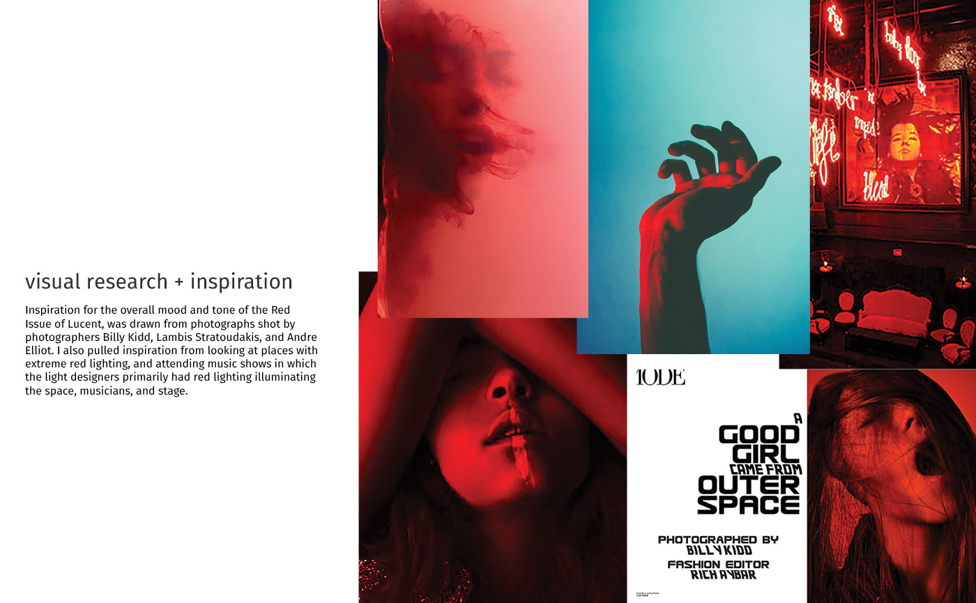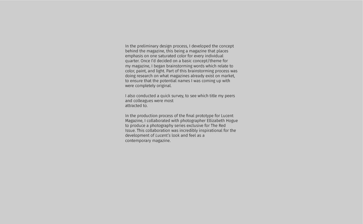 A creative magazine, open to all creative fields and mediums (art, design, light design, architecture, food, culture, etc), in which each quarterly issue is saturated with a different color. Lucent, meaning to give off light, plays up the meaning of the word, given the fact that color is created with light prisms. So as a magazine, Lucent, gives off a saturation of colorful imagery to the viewer and reader. Every quarter, Lucent, will explore the colorful complexity of our surrounding world, to highlight a curated selection of some of the spaces, places, and art & design work, in which saturated color can be found.