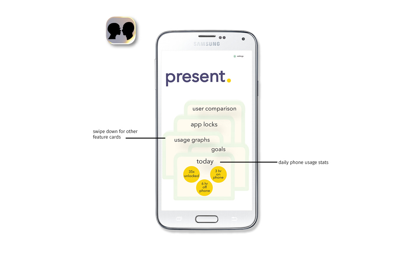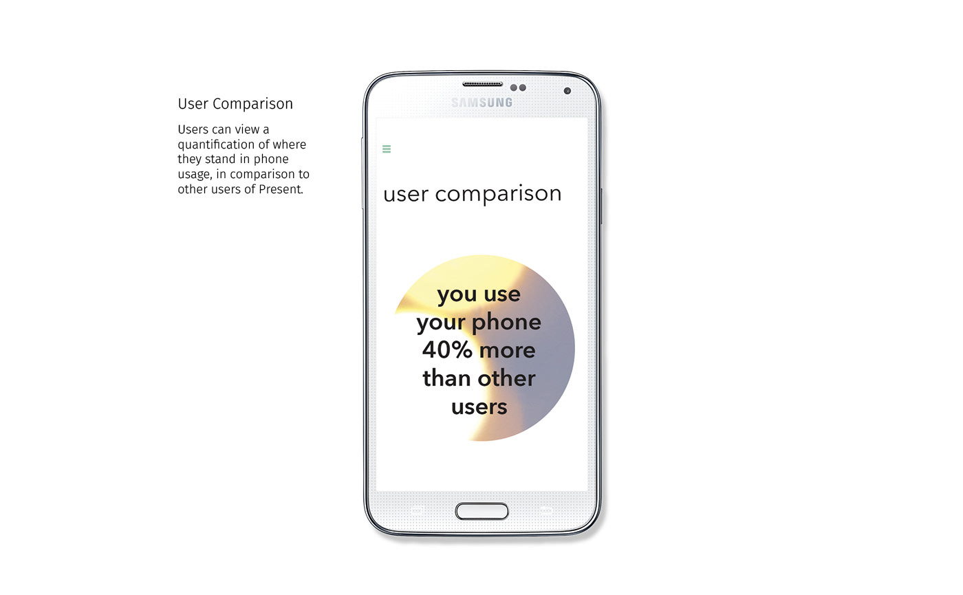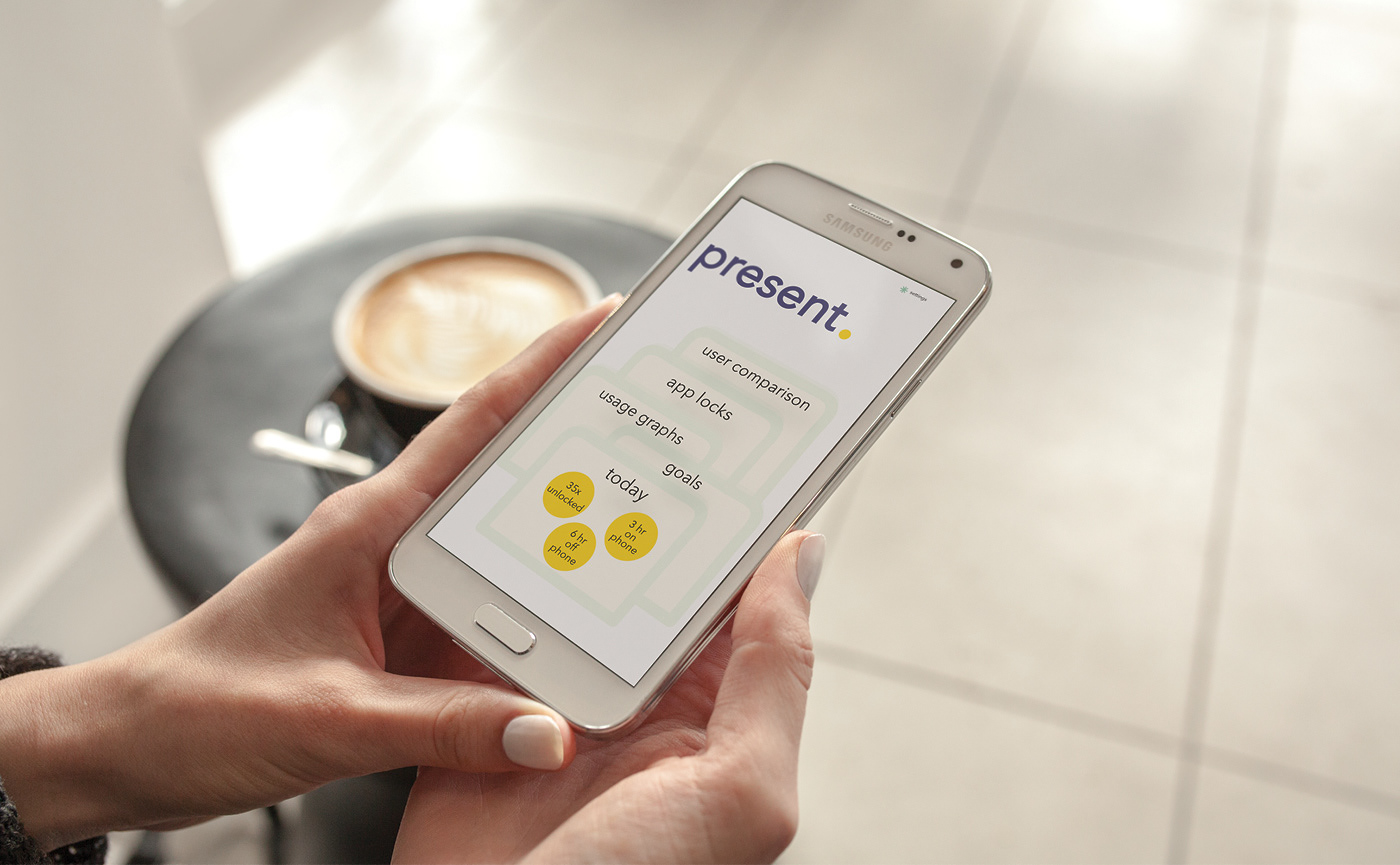 Present is a social presence and productivity app to combat technology addiction. It tracks the amount of overall time users are spending on their smartphones and social media apps, and gives them the option to limit this time and become more present in their day, and to become more socially present without using the phone as a social buffer or a crutch, as mobile phones have increasingly become.
