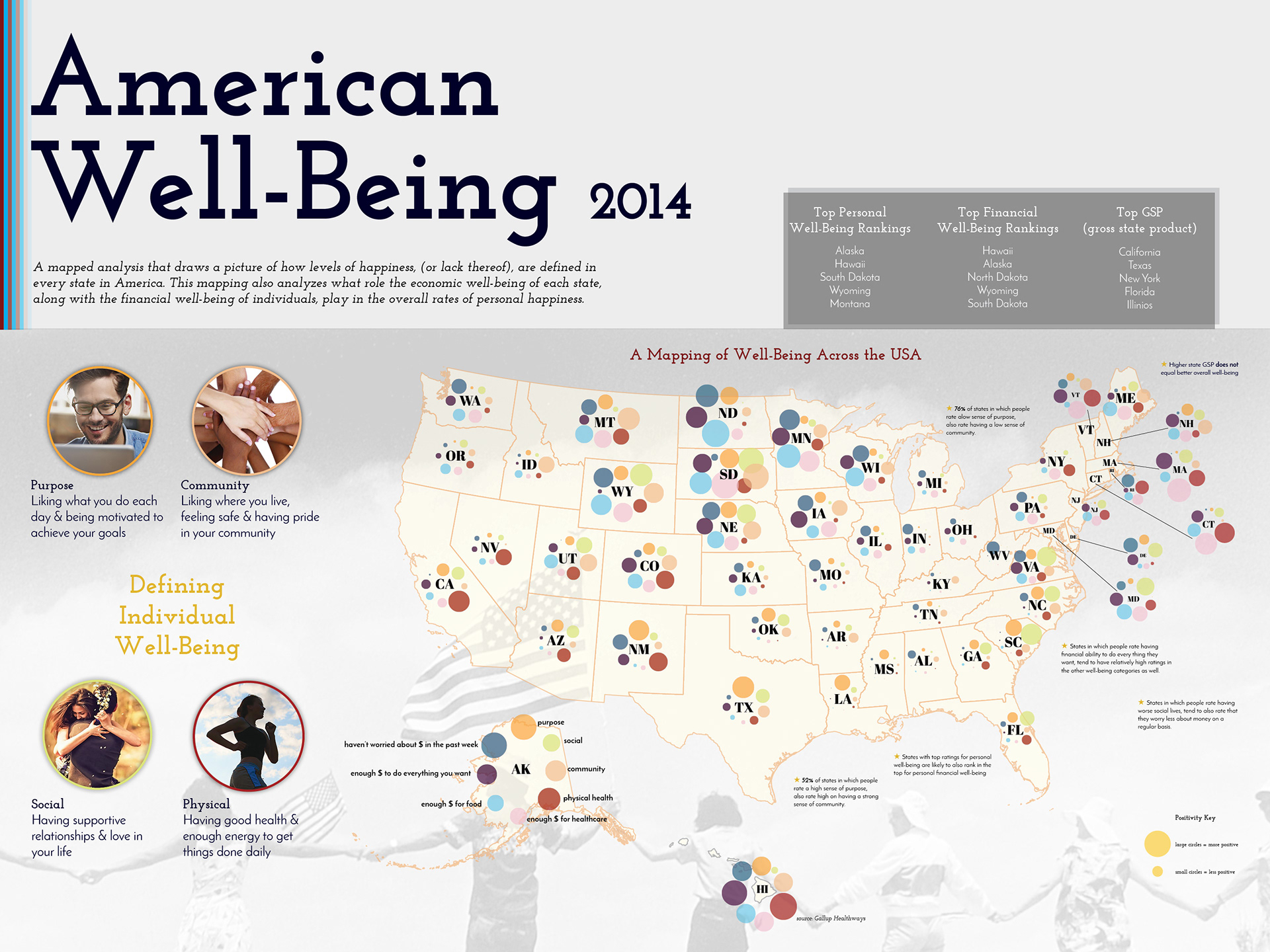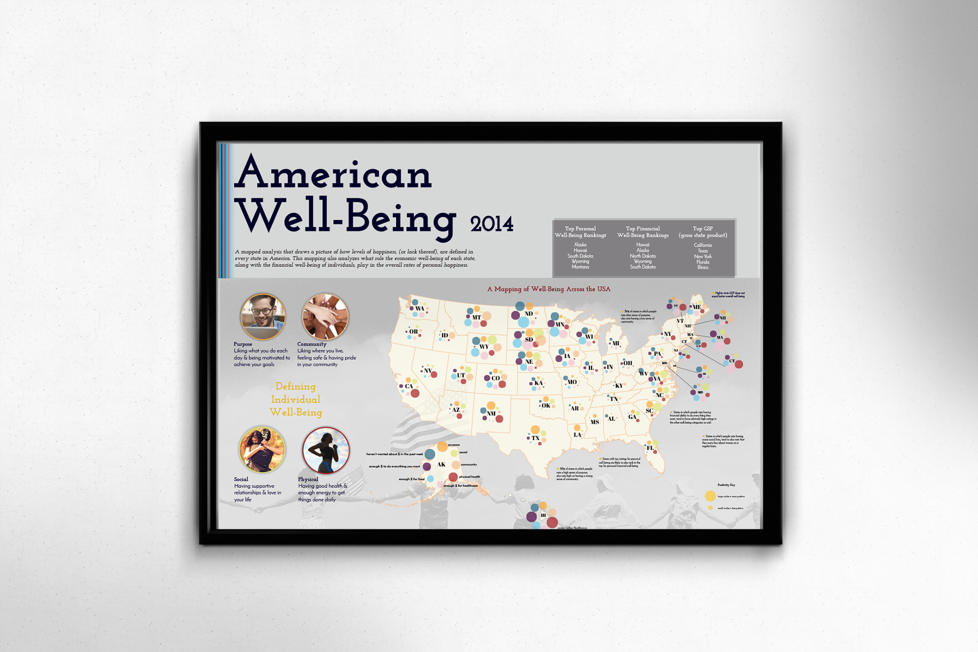A mapped infographic analysis, that draws a picture of how levels of happiness, (or lack thereof), are defined in every state in America. This mapping also analyzes what role the economic well-being of each state, along with the financial well-being of individuals, play in the overall rates of personal happiness. To create this infographic map, I analyzed the 2014 Gallup survey data on well-being in the United States, and combined all the different categories into one comprehensive infographic, so the differences from one state to another can be clearly visualized. Combining all the data sets into one visualization also allows for finding interesting patterns in the data, which I also call attention to within this poster.